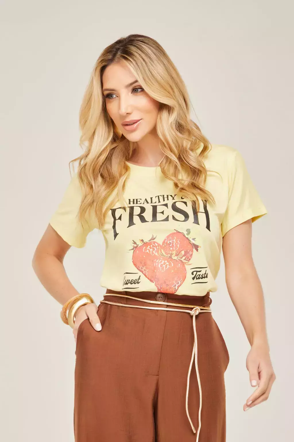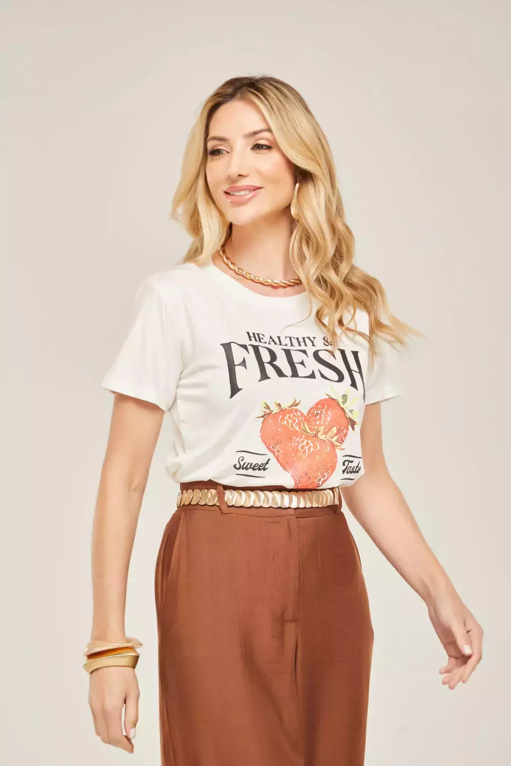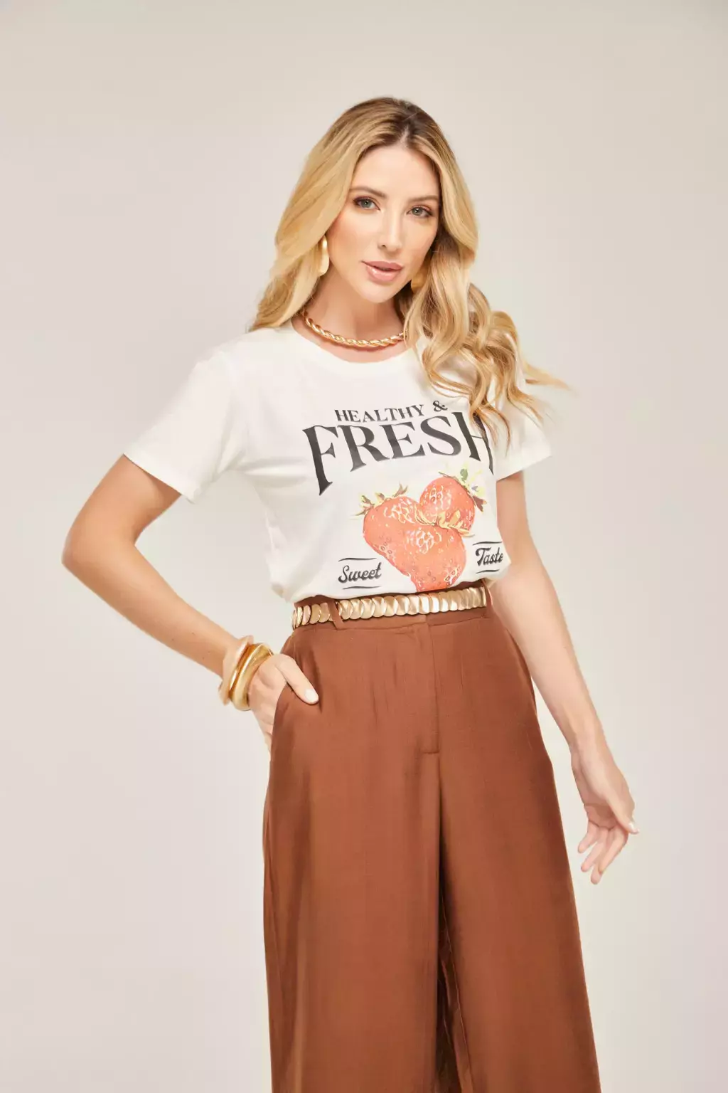 A modelagem é soltinha e confortável, ideal para combinar com jeans, saias ou shorts.